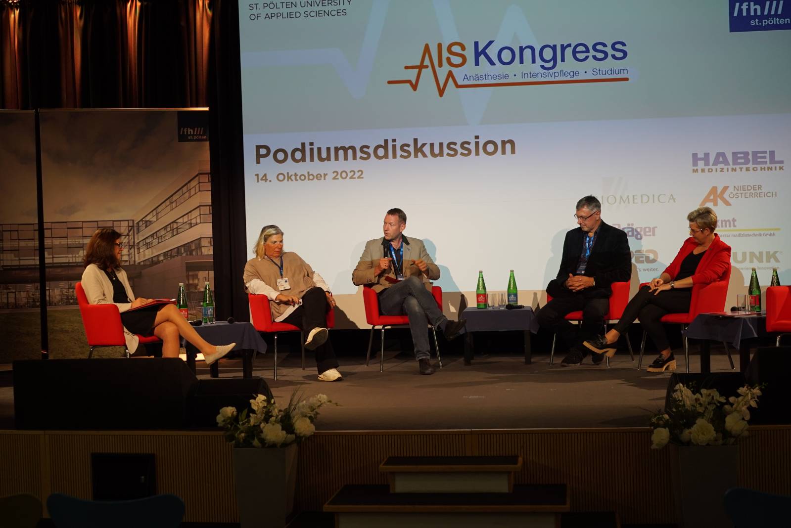 In der abschließenden Podiumsdiskussion zur aktuellen berufspolitischen Entwicklung, Gesundheitspolitik und ihrer Einflüsse auf die Fachpflege sprachen Andrea Kdolsky (ehemalige Bundesministerin, Fachärztin für Anästhesie und Intensivmedizin sowie Leitern des Departments für Gesundheit an der FH St. Pölten), Bernhard Rupp (Gesundheitsökonom, Leiter der Grundlagenabteilung Gesundheitspolitik der AKNÖ), Michaela Gansch (Pflegedirektorin am Universitätsklinikum St. Pölten) und Susanne Gröschel (Leiterin für Strategie und Qualität in der Pflege bei der NÖ LGA).